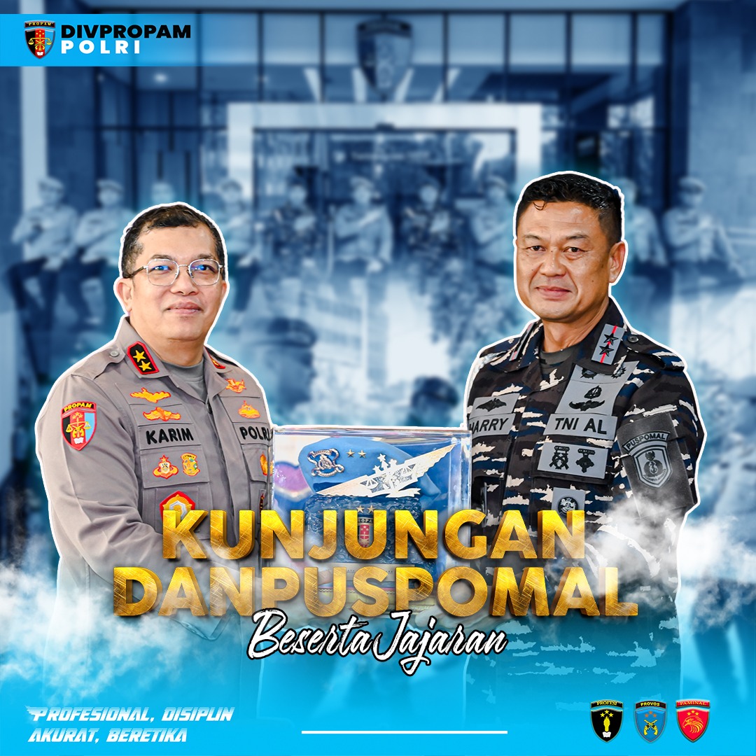 Jakarta – Divisi Profesi dan Pengamanan (Divpropam) Polri menerima kunjungan silaturahmi dari Komandan Pusat Polisi Militer Angkatan Laut (Danpuspomal) Mayjen TNI (Mar) Harry Indarto, S.E., M.M. beserta rombongan, dalam suasana penuh keakraban dan kebersamaan.