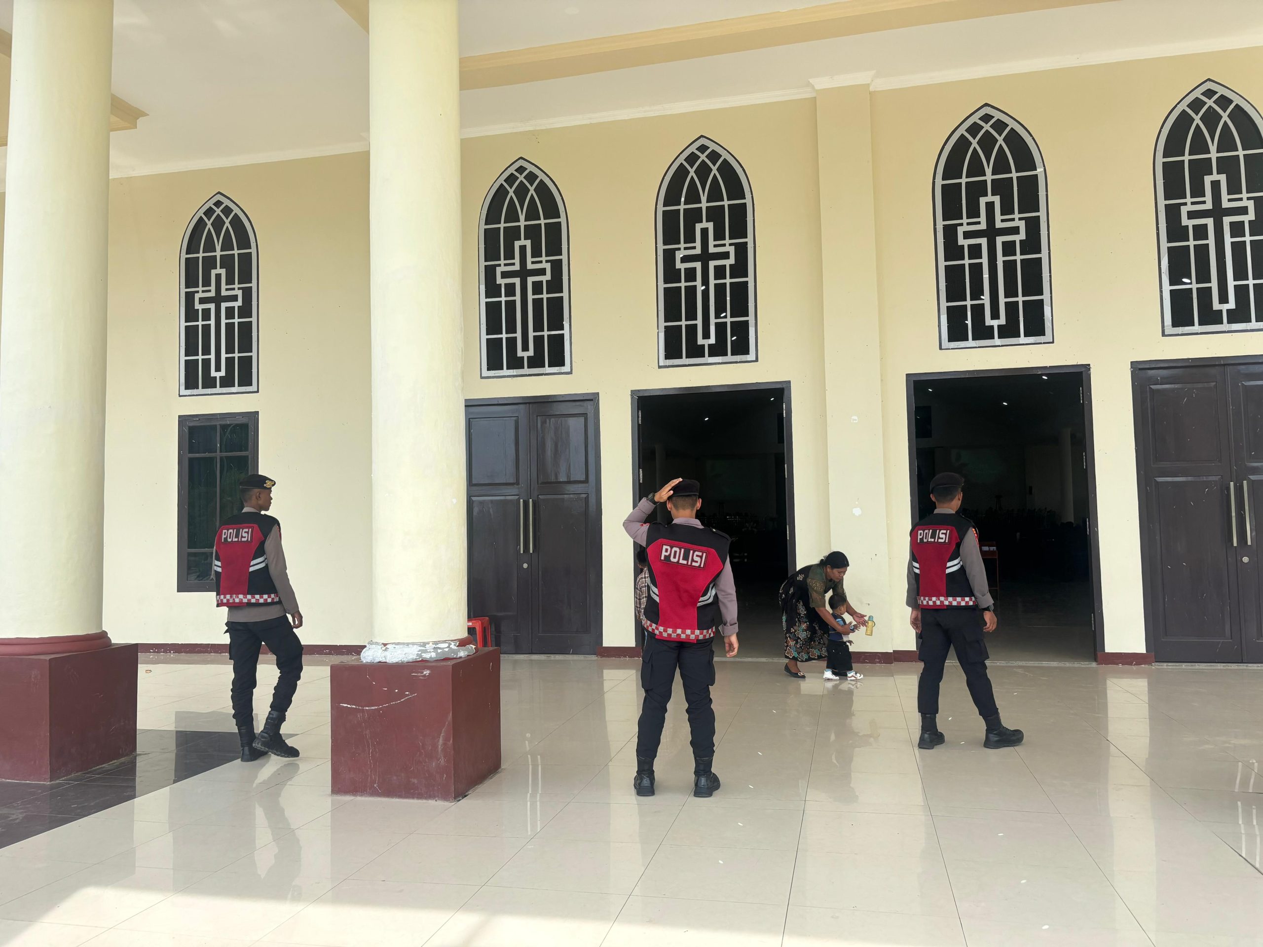 Satuan Samapta Polres Halmahera Timur melaksanakan kegiatan Pengamanan (PAM) Ibadah di beberapa gereja Kec.Maba Kab. Halmahera Timur. Minggu, (28/9/2025)